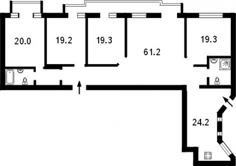 Общая площадь квартиры – 200 м². В квартире выполнен свежий высококачественный ремонт в классическом стиле. Высота потолков – 4 м. Квартира разделена на две зоны: гостевую (кухня-столовая (24 м²) + гостиная (61 м²) и спальную. Такая планировка идеально подходит для проведения приемов и комфортного проживания семьи.