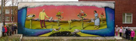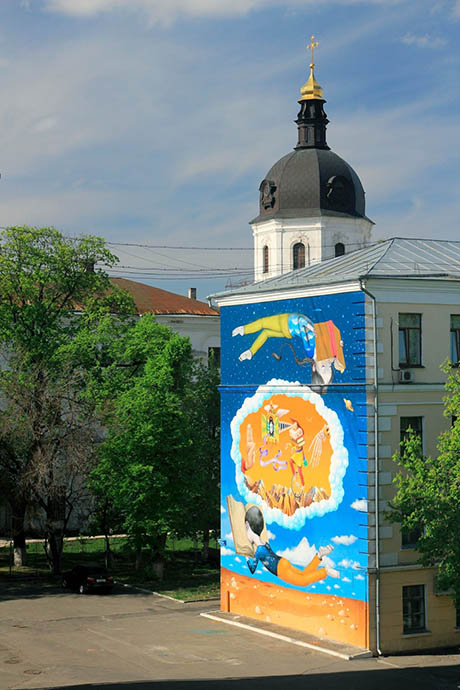 Багато стін та будівель Києва оформлені командою INTERESNI KAZKI. Прогулюючись по Печерську, біля Галереї Лаври, Харківському масиву, Виноградарі, Шулявці, ТЦ Більшовик, можна випадково попасти на виставку моралізму ( моментальний живопис на будівлях). Розглядати малюнки можна безкінечно – продумана кожна деталь, і вдивляючись в картини, можна з кожним разом відкривати щось нове, непобачене до цих пір. Стиль, в якому вони працюють, відомий всім. Тому, випадковий прохожий, звернувши увагу на картину на стіні будівлі може сказати: «Так це ж INTERESNI KAZKI! Я їх знаю».
