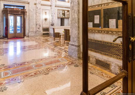 Ліфт, на підлозі якого знаходиться антикварна мозаїка з логотипом готелю.