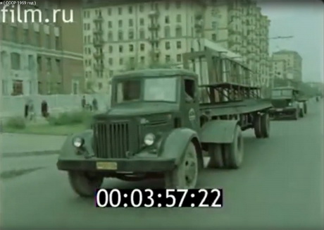 Панелі везуть з заводу на будівельний майданчик. У фільмі немає ні слова про те, скільки країні коштувало спорудження спеціальних тягачів, створення інфраструктури з логістики панелей і збиток для доріг від перевезення таких вантажів – радянським громадянам не обов’язково знати про це.