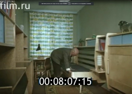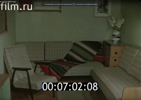 Багато слів в кіно присвячено тому, як люди будуть жити в нових будинках. За задумкою авторів фільму інтер’єр у нових будинках повиннен виглядати якось-так, це вітальня. Скажіть, ви бачили серед радянських меблів 1950-60-х років щось подібне? Меблеві зразки взято із західних каталогів.