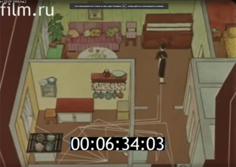 Після цього, показано кадр, як радянська домогосподарка повинна рухатися по квартирі в процесі приготування борщу. Дійсно - якщо кухня є настільки маленькою, що каструлі потрібно тримати у серванті в кімнаті - то ще й не стільки кроків пробіжиш.